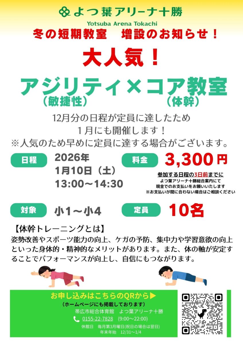 作成日:2025年11月29日(土曜日) 冬の短期教室 アジリティ×コア教室増設!! 大人気で12月分が定員に達したため1月に増設しました! ご予約お待ちしております。 その他の教室も残り少なくなってきています。ぜひご参加ください!